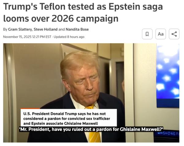 受害者的声音同样被淹没在党争噪声中。舆论反复解读个别受害人对特朗普的只言片语,却很少再谈她们对整个体系失灵的控诉。当“爱泼斯坦档案”一次次被当作选战工具,社会的愤怒感与正义感也在不断被消耗,人们习惯了这类新闻,却越来越不相信它能真正导向清晰的真相和实质的问责。