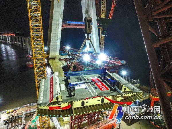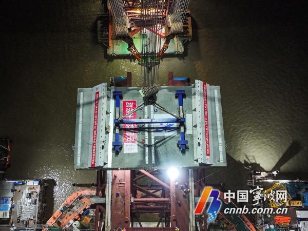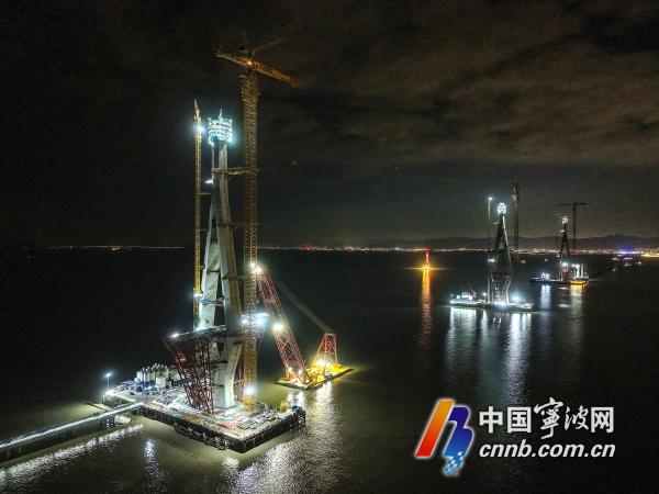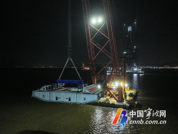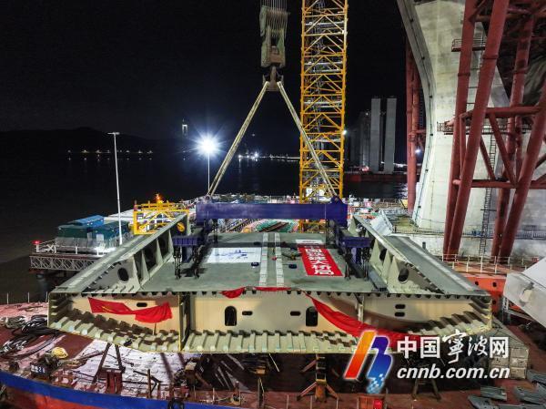 11月15日晚,宁波舟山港六横公路大桥二期工程青龙门特大桥灯火通明,随着一艘1200吨级的大型浮吊船把一片钢箱梁稳稳地吊装到青龙门特大桥上,标志着这座世界最大跨度三塔钢箱梁斜拉桥正式拉开上部结构施工序幕,为项目后续贯通奠定关键基础。