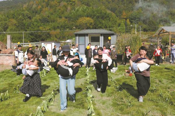 现场,“秋收运动会”成了欢乐的海洋。在拔河比赛中,家长们奋力拼搏,给孩子们树立了拼搏与协作的榜样。在“红薯争霸赛”中,亲子默契配合,在限定区域内巧妙协作传递果实。“秋日运粮队”项目里,小班的宝宝在家长协助下背起小背篓,勇敢走过平衡木;中大班的孩子们则两两合作,手提竹篮,将玉米、番薯、南瓜等“粮食”分类运送,体验了一把“小小运输员”的责任与乐趣。孩子们在奔跑、攀爬与协作中尽情释放天性,锻炼了体能和勇气。