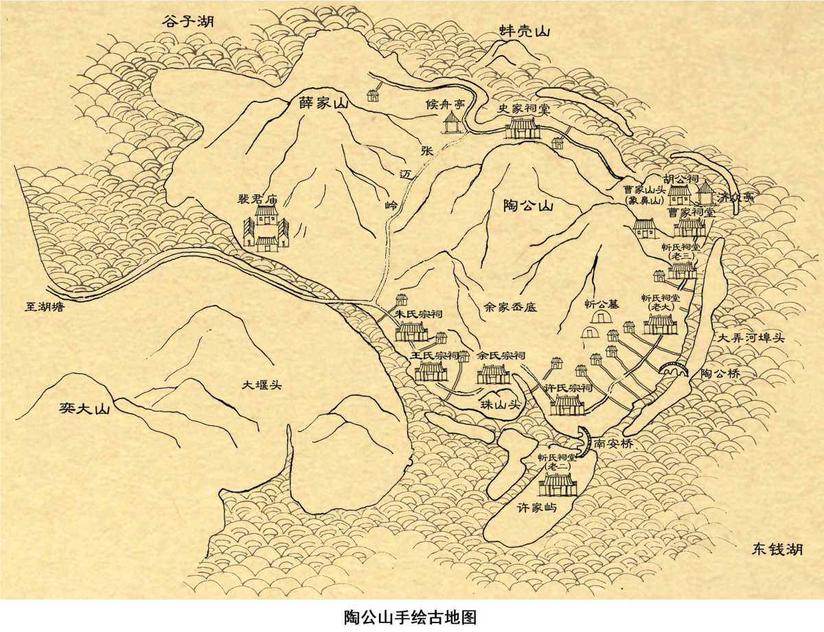 陶公山手绘古地图。图源宁波市东钱湖旅游度假区东钱湖镇陶公村、建设村、利民村历史文化名村保护规划(2021-2035年)规划文本
