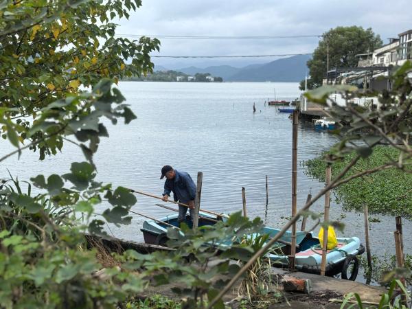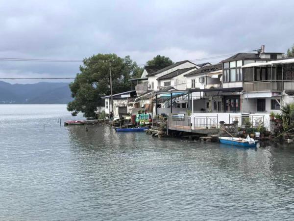 从三村尾端的利民村起步,沿着湖岸徐行,粗粝的石阶层层叠叠地探入水中,石缝间缀着深绿的青苔,几艘小船在浅波里轻轻摇曳。