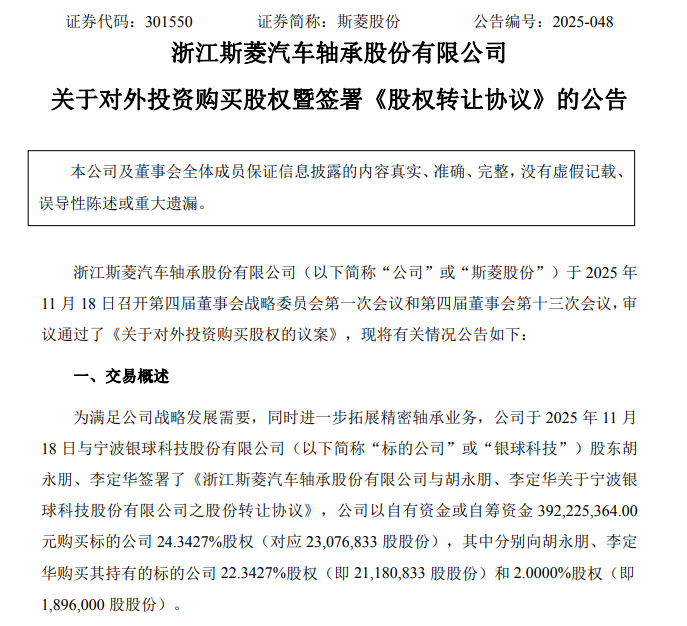 11月18日,来自浙江新昌的上市公司——浙江斯菱汽车轴承股份有限公司(以下简称斯菱股份)公告称,当天,该公司签署一项股份转让协议。而这则协议的购买标的,是宁波轴承行业龙头企业——宁波银球科技股份有限公司(以下简称银球科技)的股权。
