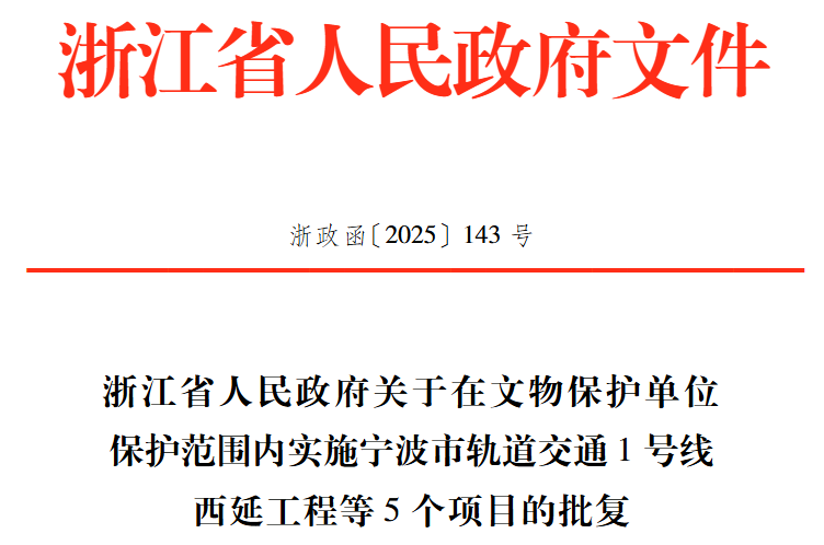 原则同意在省级文物保护单位浙东运河河道(萧山段、绍兴段、宁波段)西塘河保护范围内实施宁波市轨道交通1号线西延工程。