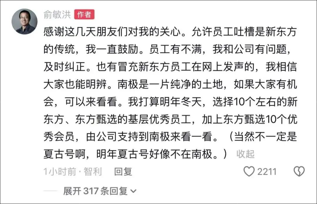 俞敏洪还在评论区回应:感谢这几天朋友们对我的关心。允许员工吐槽是新东方的传统,我一直鼓励。员工有不满,我和公司有问题,及时纠正。也有冒充新东方员工在网上发声的,我相信大家也能明辨。南极是一片纯净的土地,如果大家有机会,可以来看看。我打算明年冬天,选择10个左右的新东方、东方甄选的基层优秀员工,加上东方甄选10个优秀会员,由公司支持到南极来看一看。(当然不一定是夏古号啊,明年夏古号好像不在南极。)