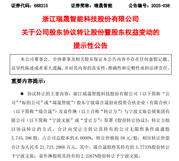 11月20日,宁波上市公司瑞晟智能公告称,公司股东——宁波瑞合晟创业投资合伙企业(有限合伙)(以下简称瑞合晟)、袁作琳,拟将其持有的公司6%的股权(3745396股),以58元/股的价格,转让给宁波文旅会展集团有限公司(以下简称宁波文旅集团),相应转让价款合计为2.17亿元。
