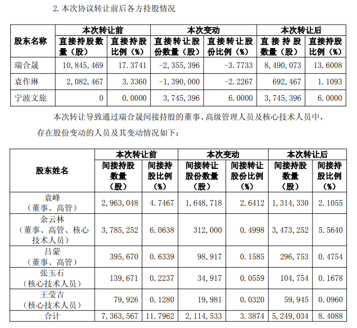 本次权益变动后,瑞合晟、袁作琳的持股占比分别下降至13.6008%、1.1093%,而宁波文旅集团将成为瑞晟智能的第三大股东。
