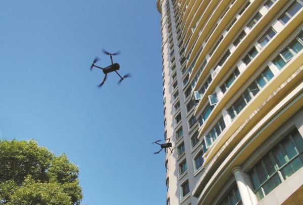 两台搭载红外热像仪的无人机正在对小区外墙进行扫描。记者刘波/摄