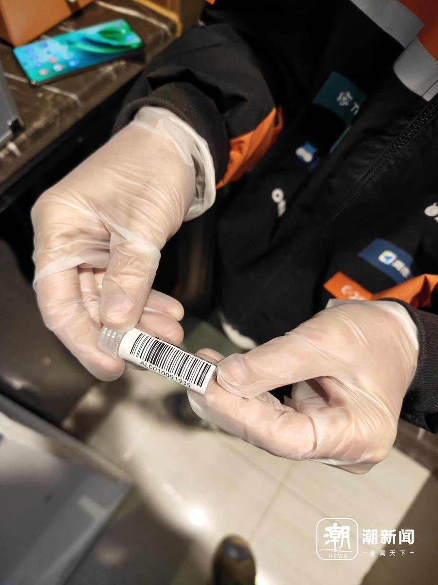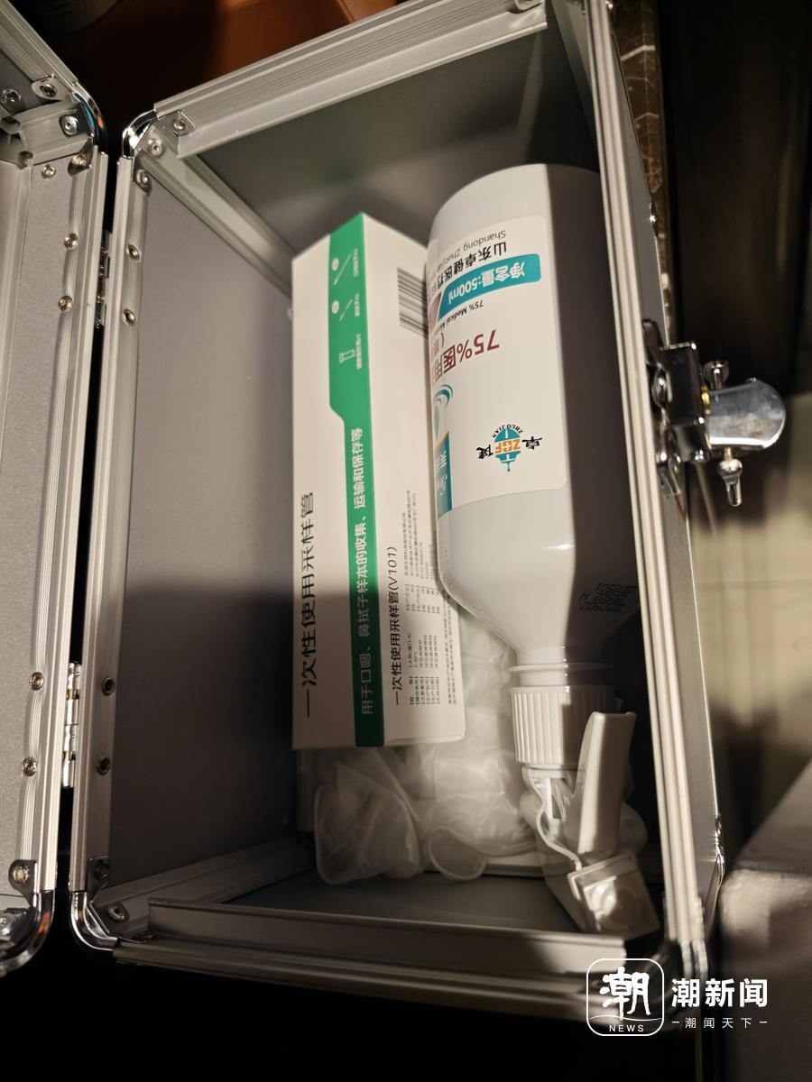 记者注意到,外卖员会穿戴好一次性手套,并喷洒酒精喷雾后,打开采样管。盒内有一瓶保存液,一根咽拭子和一根鼻拭子。