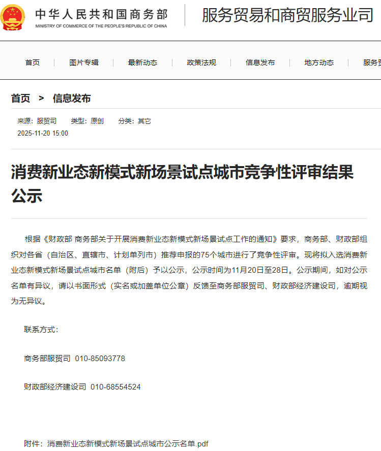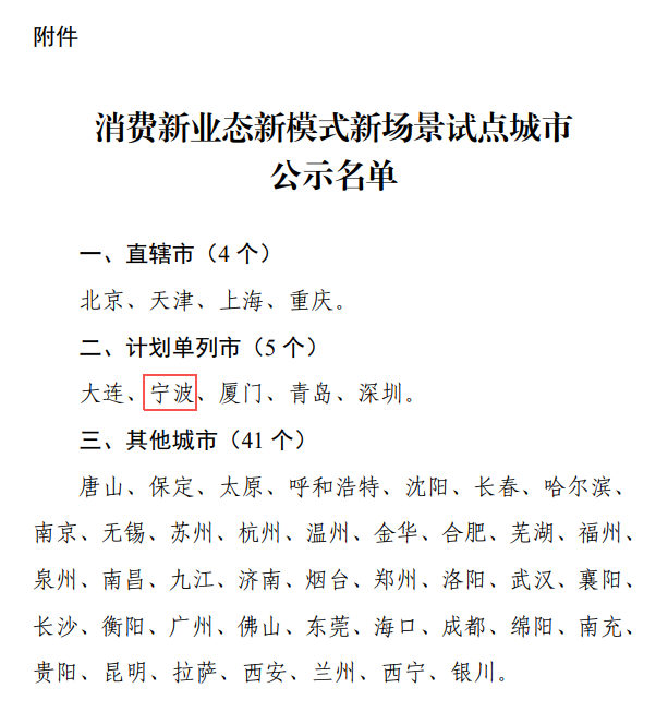 11月20日,商务部网站公布了消费新业态新模式新场景试点城市竞争性评审结果公示,确定了包括宁波在内50城入选。公示时间截至28日。