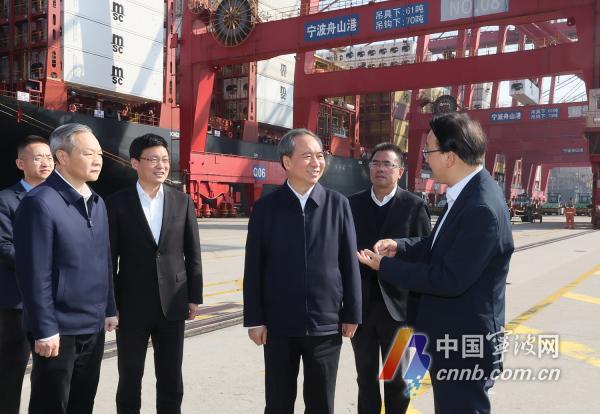 宁波舟山港穿山港区,岸线上靠满巨轮,桥吊装卸不停。20年前,正是在习近平同志的亲自推动下,宁波-舟山两港一体化拉开序幕。如今,宁波舟山港已成为全球年货物吞吐量16连冠的超级大港,拥有航线300余条,连接全球200多个国家和地区的600多个港口。王成来到港区,重温习近平总书记考察宁波舟山港穿山港区时的重要讲话精神,深入了解宁波舟山港打造世界一流强港情况。他强调,习近平总书记一直对宁波发展关怀备至,在浙江工作期间和到中央工作后37次亲临宁波考察,为宁波发展把脉定向、指路引航,特别是习近平总书记十分关心宁波舟山港的发展,勉励宁波努力打造世界一流强港,为国家发展作出更大贡献。我们要深刻领悟厚望之切、责任之重,开放图强、向海图强,把港口“最大资源”和开放“最大优势”发挥到极致,统筹硬件和软件,抓好平台提能级、枢纽建强、模式创新“三件大事”,不断提升资源配置力、全球辐射力、制度创新力、国际竞争力,更好服务“国之大者”。