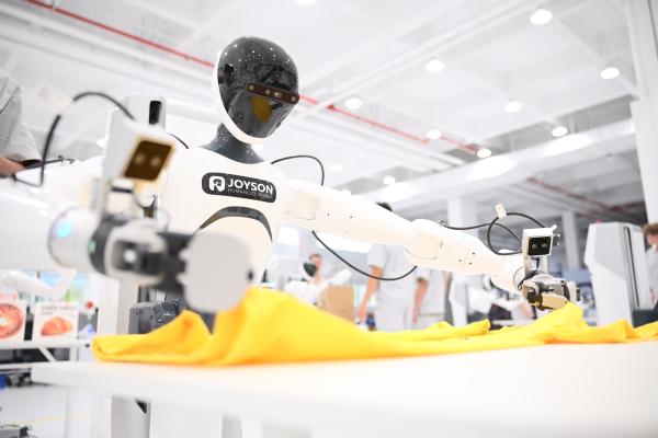 普智未来的人形机器人叠放衣物。(孙佳骏 殷聪摄)
