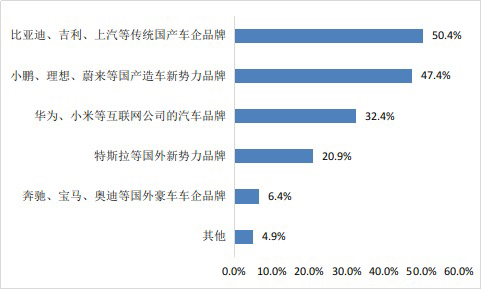 在已购或意向购买的品牌中,50.4%的受访者倾向比亚迪、吉利、上汽等传统国产车企品牌,47.4%的受访者青睐小鹏、理想、蔚来等国产新能源汽车新势力,华为等互联网公司汽车品牌及特斯拉等国外新势力品牌分别获得32.4%、20.9%受访者青睐。