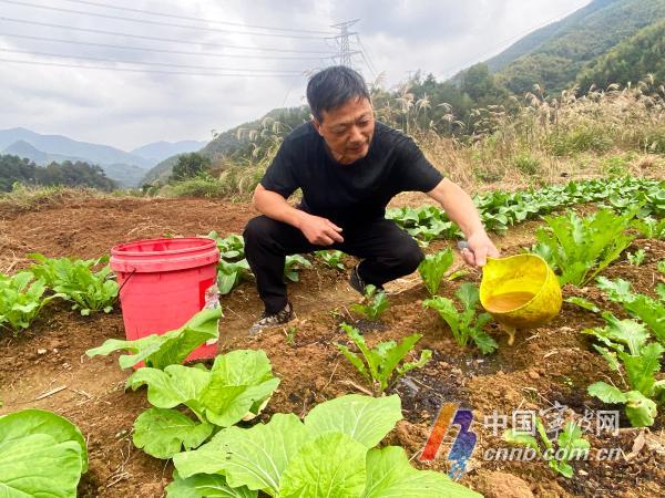 一大早,奉化区大堰镇箭岭村村民徐春定在家中拿上锄头、镰刀后,前往承包的菜地耕作,随身携带的还有3个塑料桶。
