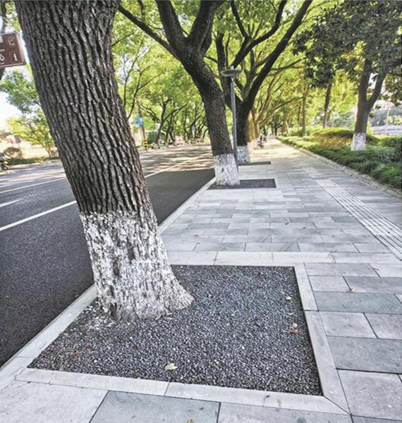 长春路沿线的行道树基本是樟树,种了几十年,树冠硕大。原来的树穴框是用花岗岩条石做的,大小在1米见方。随着树越长越大,树干愈发粗壮,很多树穴都快“盛不下了”,地面都拱了起来。“这次道路改造,我们拆掉了行道树原来的树穴框,并把树穴扩大到1.5米见方,用砾石覆盖树穴表土。”徐亮说。