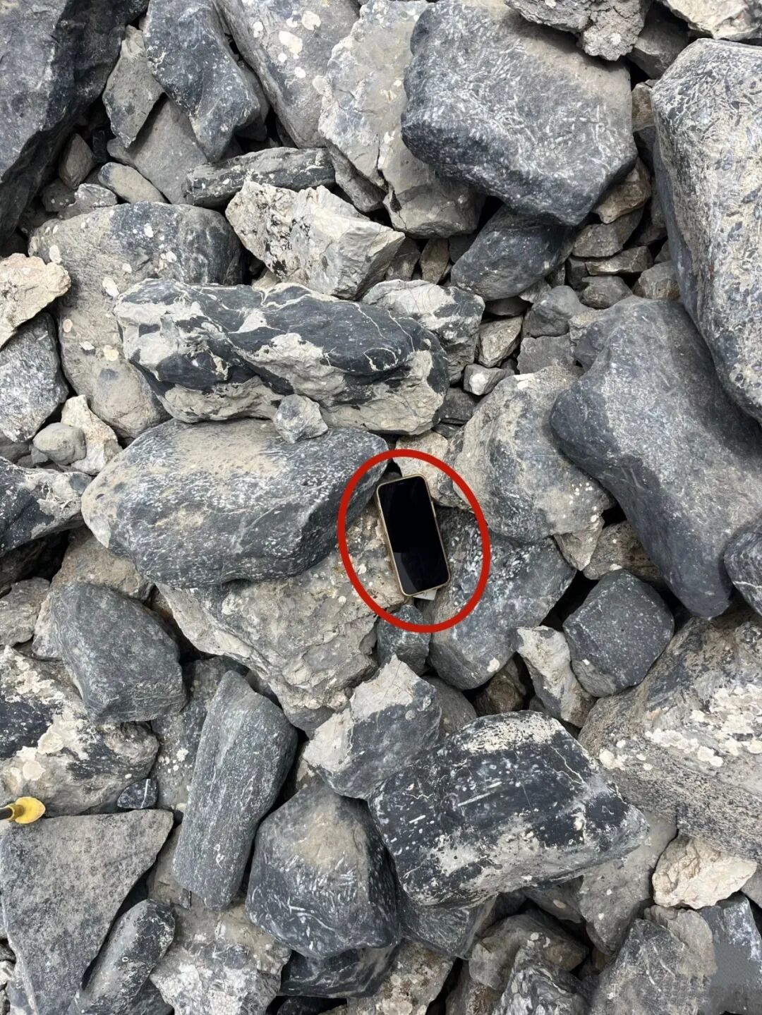 △郭先生拍照时发现石块间的手机。