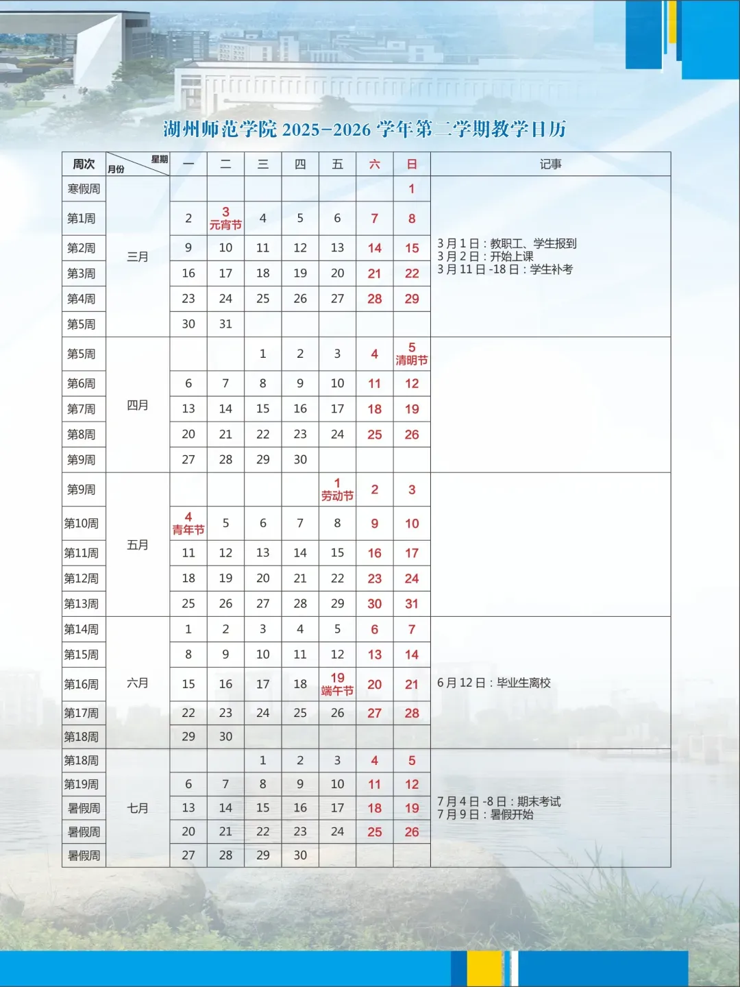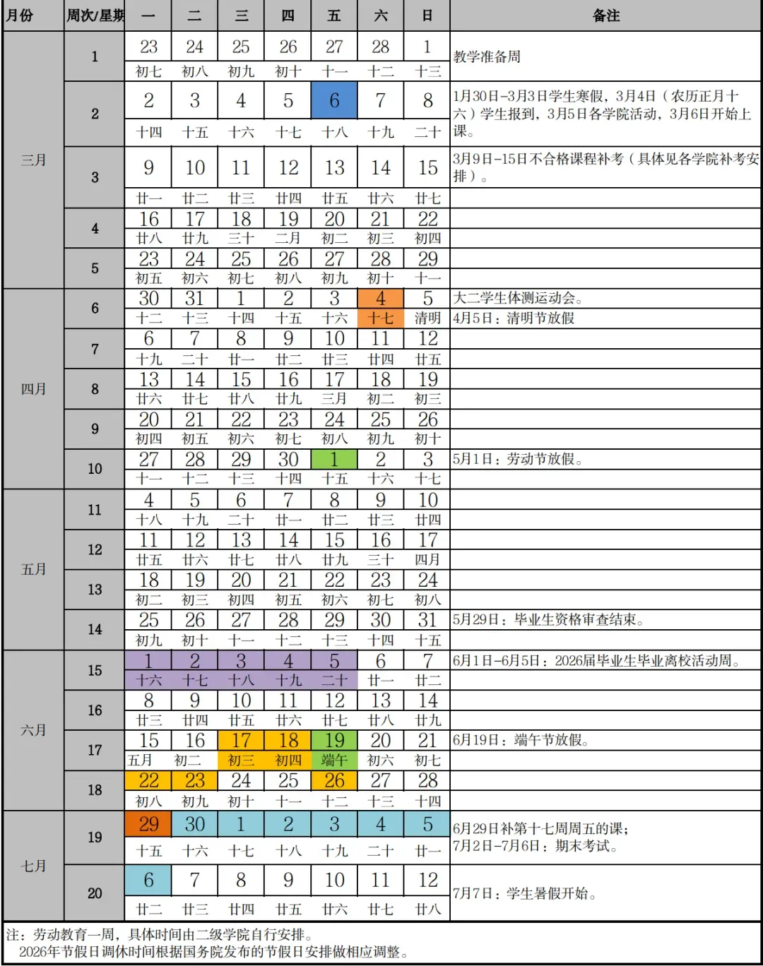 2025-2026学年第二学期,小学、初中、普高、中职(技工)定于2026年3月4日开学;2026年7月4日学期结束,7月5日放假,共十八周。