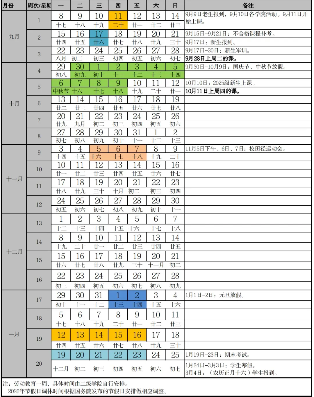 2025-2026学年第一学期,小学、初中、普高、中职(技工)定于2026年2月6日学期结束,2月7日放假,共二十三周。