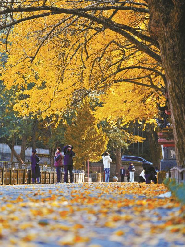 山门银杏大道上,200余棵古银杏树铺就“黄金通道”,青石板路落满金叶;万工池边,银杏倒影与古樟相映。游客们纷纷慕名而来,或驻足拍照定格美景,或漫步古道感受秋韵。