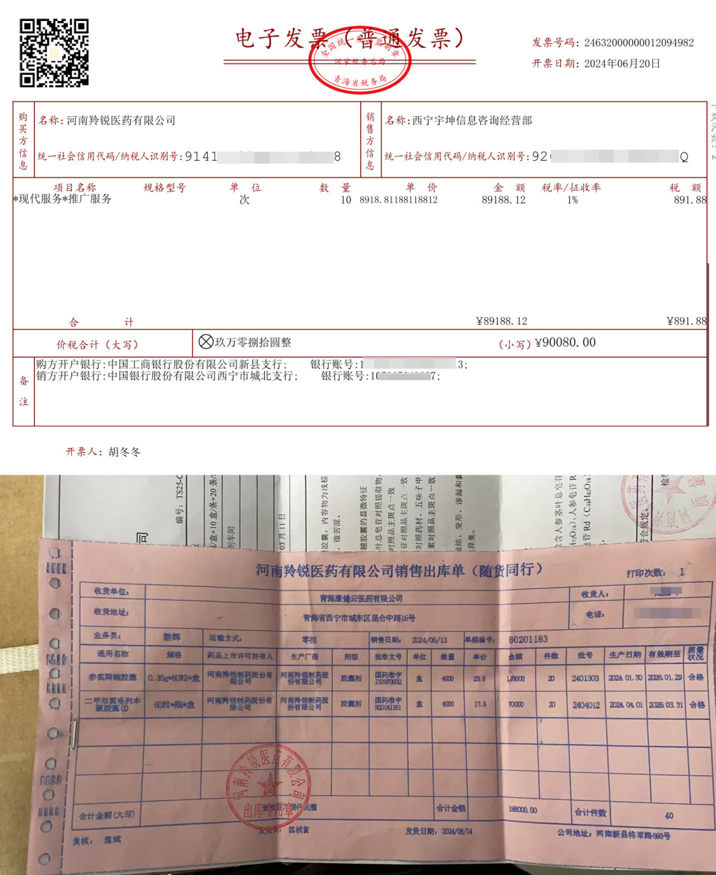 上图:推广服务发票;下图:羚锐制药销售出库单,受访人提供