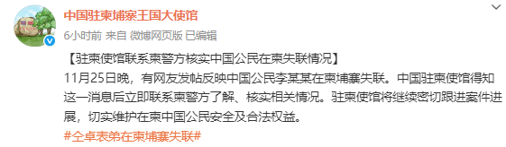 11月26日,据 @中国驻柬埔寨王国大使馆 消息,11月25日晚,有网友发帖反映中国公民李某某在柬埔寨失联。中国驻柬使馆得知这一消息后立即联系柬警方了解、核实相关情况。驻柬使馆将继续密切跟进案件进展,切实维护在柬中国公民安全及合法权益。