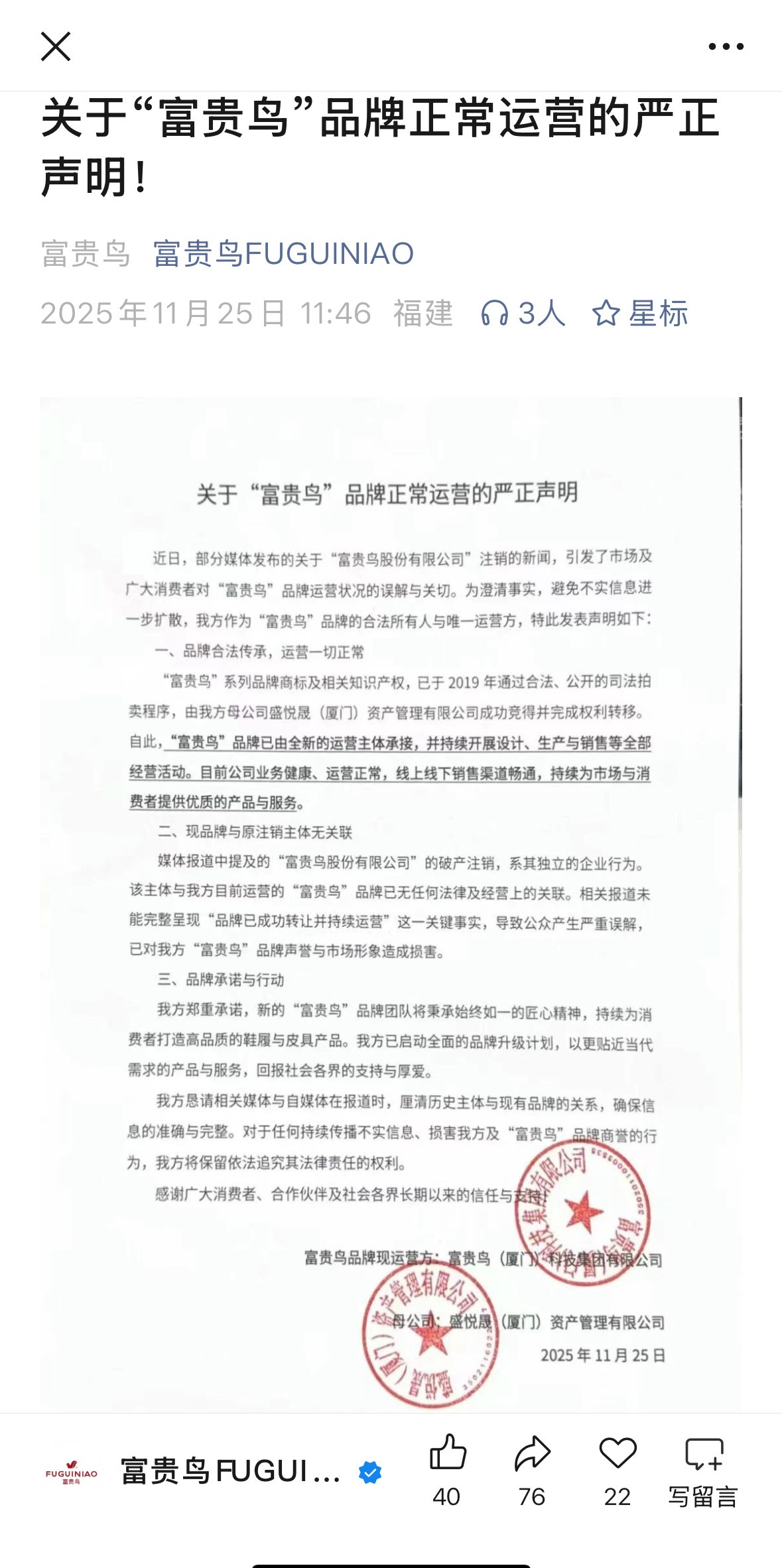 部分报道中提及的“富贵鸟股份有限公司”破产注销,系其独立的企业行为,“该主体与我方目前运营的‘富贵鸟’品牌已无任何法律及经营上的关联。”