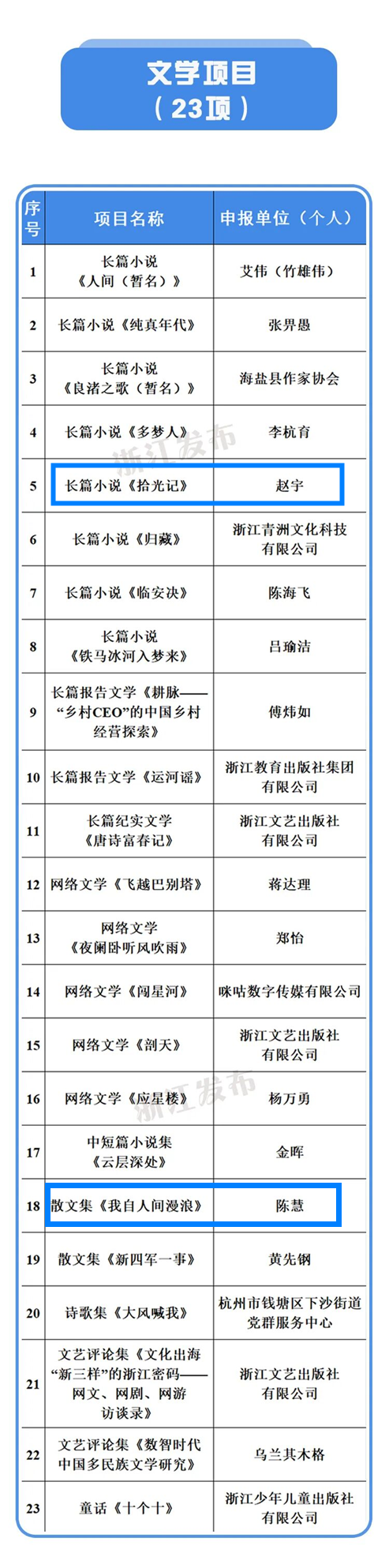近日,2025年度浙江文化艺术发展基金资助项目公布,全省23个入选的文学项目中,宁波占据两席——作家赵雨(本名赵宇)的长篇小说《拾光记》与陈慧的散文集《我自人间漫浪》成功入围,获省级专项资金扶持,为甬城文学版图再添亮色。