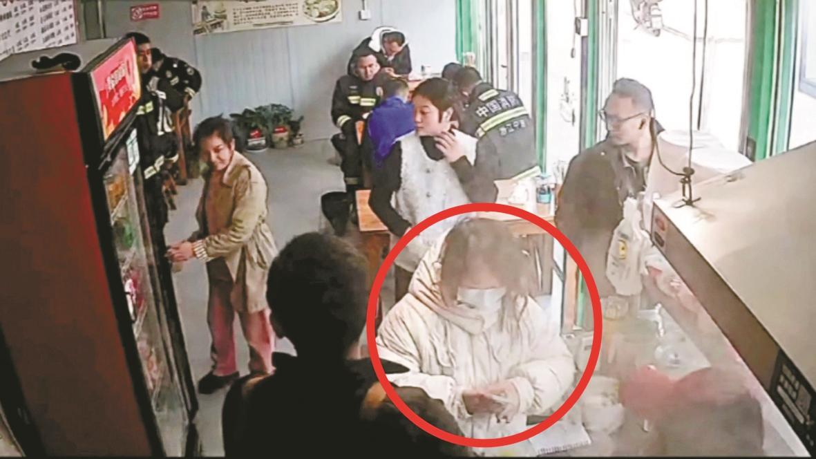 默默为消防员买单的白衣女子。本文图片均为公共视频截图