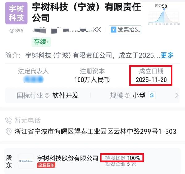 据天眼查信息,由宇树科技股份有限公司100%控股的宇树科技(宁波)有限责任公司,已于本月20日成立。