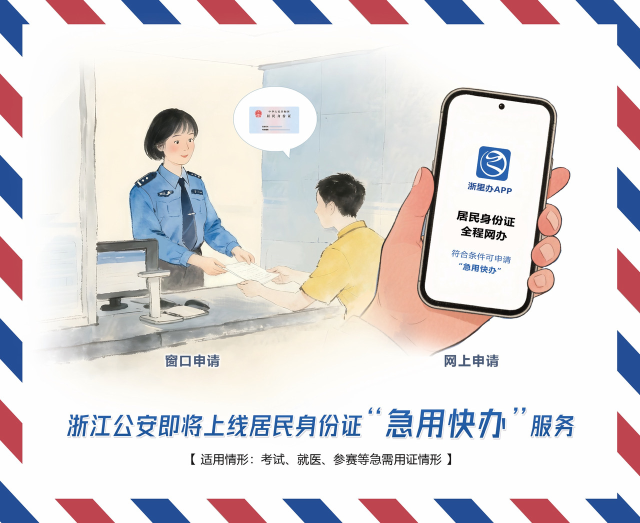 记者11月28日从浙江省公安厅居民身份证制作中心了解到,12月1日,浙江省居民身份证“急用快办”服务将正式在“浙里办”App上线运行。届时,群众在参加考试、参赛、省外就医等急需用证情况下,只需申请该项服务,即可在3至5个工作日内领取证件。