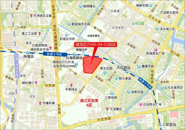 地块位于镇海庄市,邻地铁5号线兴海南路站、应行久外语实验学校(庄市校区),北面不远是庄市老街、南面不远是甬江实验室A区。另外,按照此前规划,该地块南侧规划有一个公园。