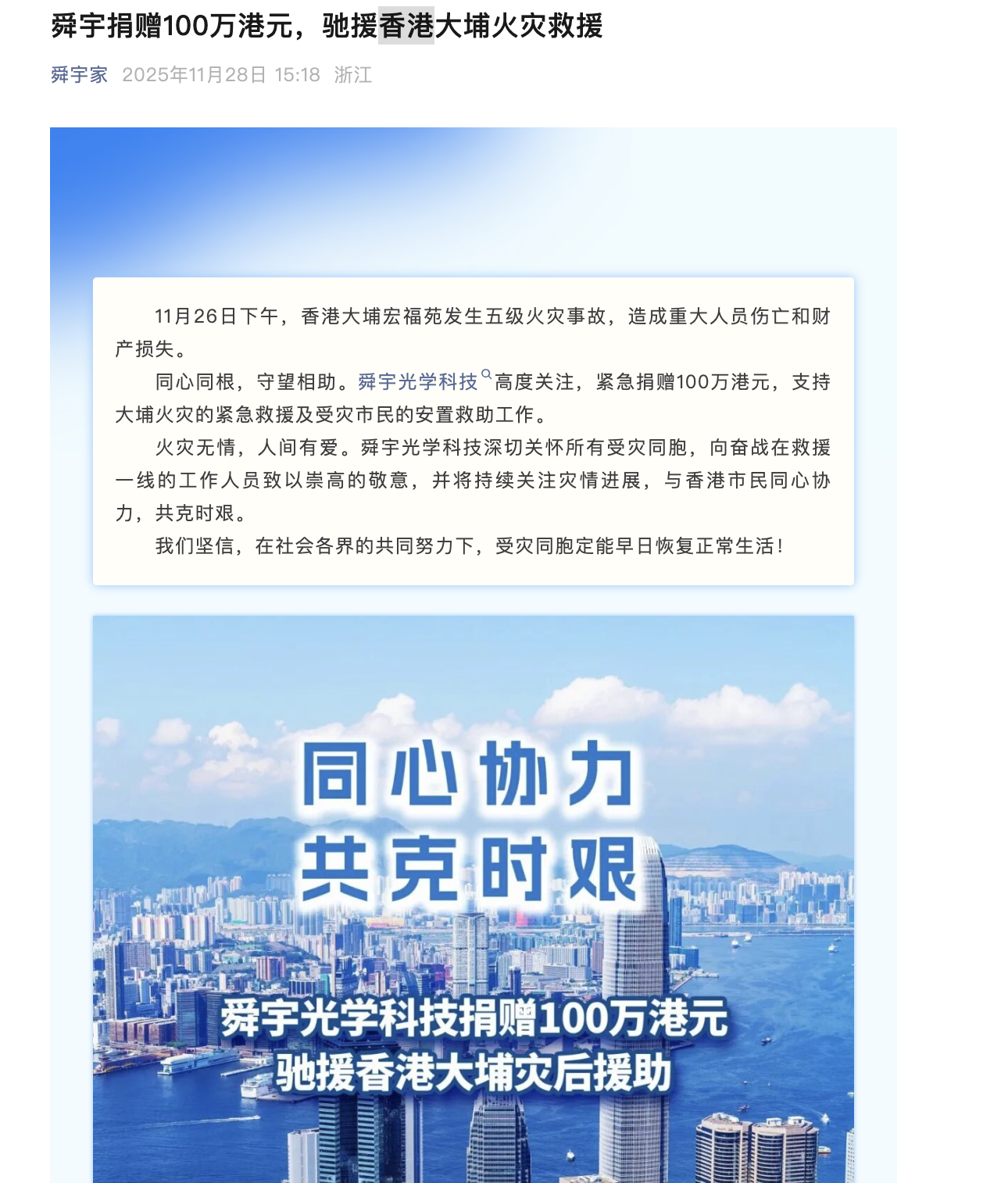 舜宇光学科技也宣布捐赠100万港元,专项支持火灾紧急救援及受灾市民安置救助。