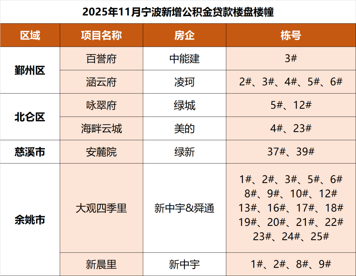 据宁波市住房公积金管理中心最新消息,本月宁波全市新增7个楼盘的36幢住宅可用公积金贷款。具体名单如下: