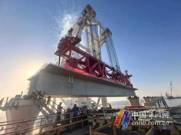 今年9月底,大桥嘉兴侧已率先启动架梁。随着宁波侧架梁施工的展开,大桥实现南北两侧同步推进架梁,全面进入建设提速阶段。