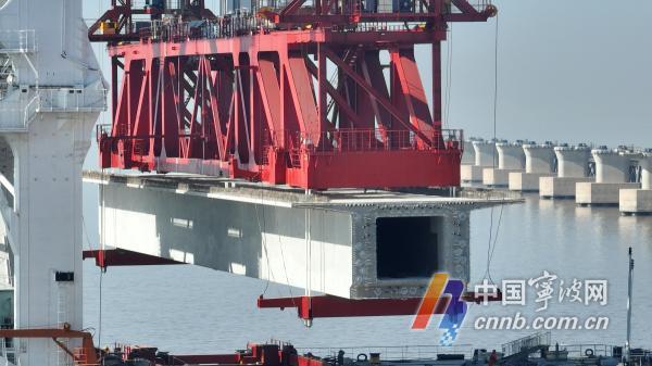 随着“天一号”运架一体船将重达2804吨的箱梁缓缓吊起,今天,杭州湾跨海铁路大桥宁波侧开启首孔箱梁架设,大桥的海中引桥进入全面架梁施工阶段。