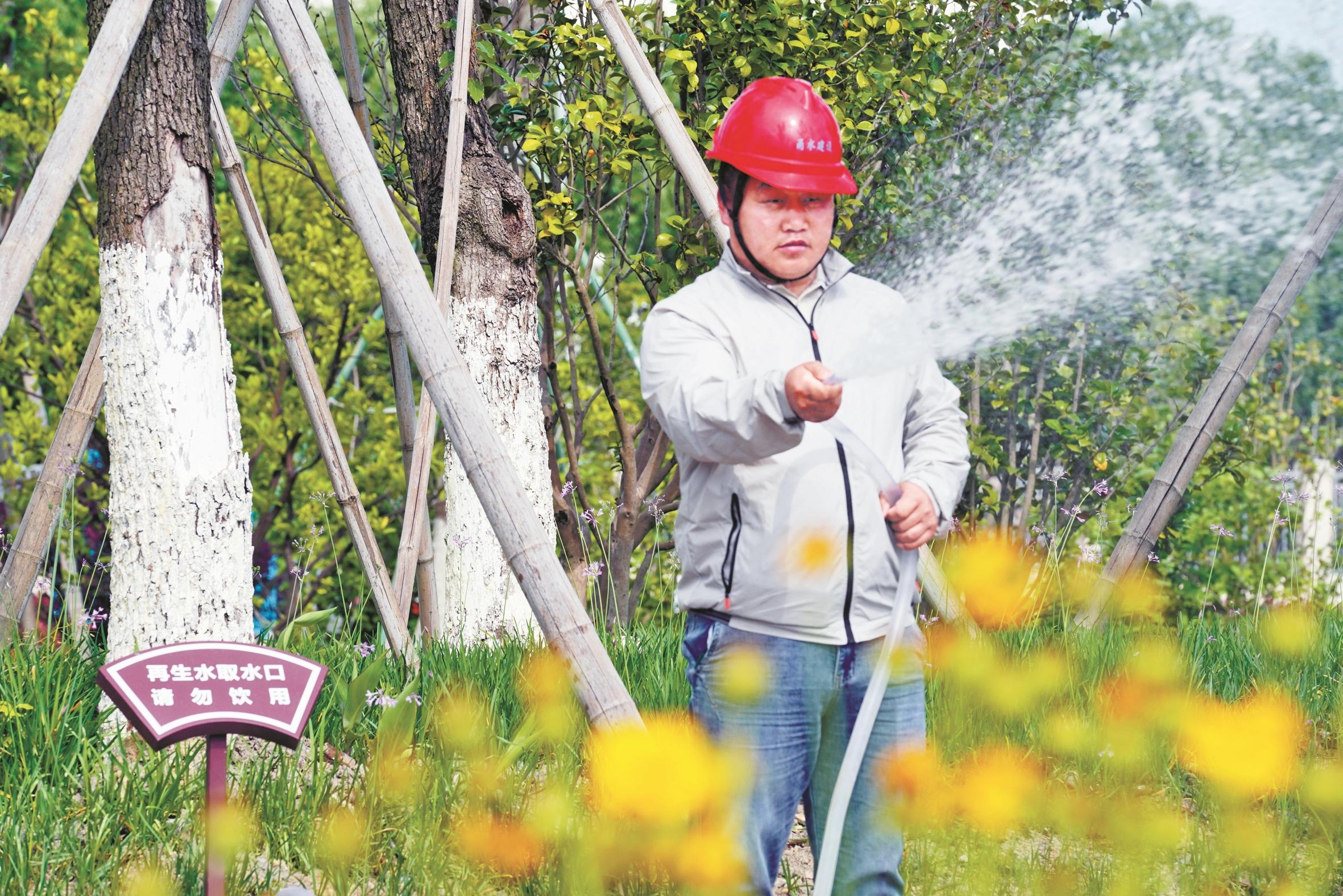 滨江公园工作人员用再生水浇灌植株。(林涵摄)