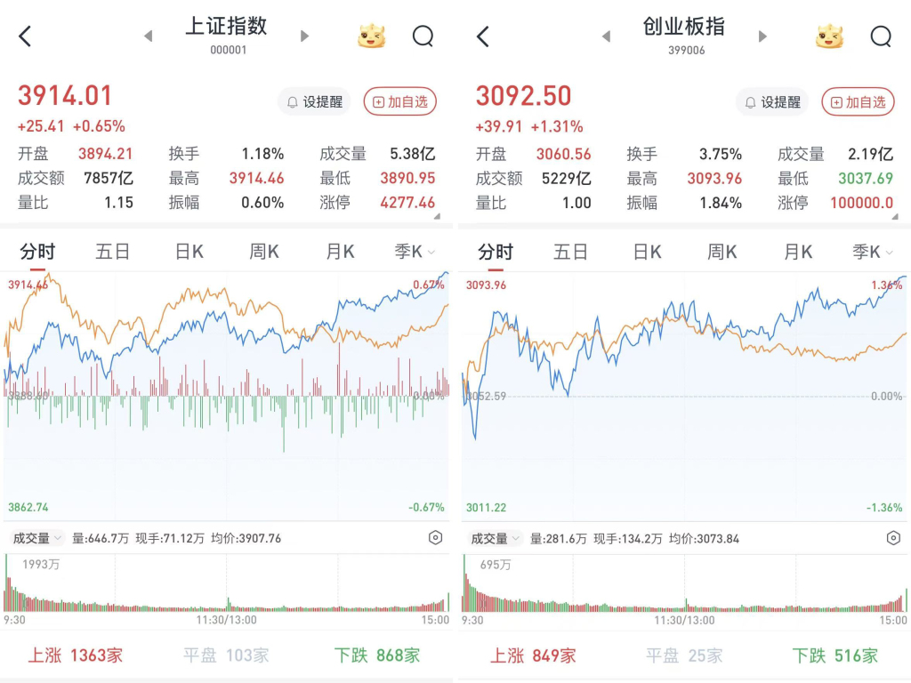 至收盘,上证综指涨0.65%,报3914.01点;科创50指数涨0.72%,报1336.76点;深证成指涨1.25%,报13146.72点;创业板指涨1.31%,报3092.5点。