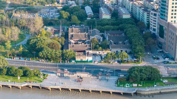 庆安会馆(含安澜会馆)坐落于江东北路156号,依偎着奉化江、余姚江、甬江的交汇处,近万平方米的开阔天地间7000余平方米的建筑群静静矗立,与江景相映成趣。