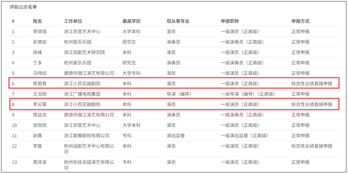 浙江省人社厅网站12月1日发布《2025年度浙江省文化广电和旅游厅艺术系列高级(艺术一级)专业技术职务任职资格评审计划评前公示》,其中,浙江小百花越剧院演员陈丽君、李云霄以标志性业绩直接申报一级演员(正高级)。