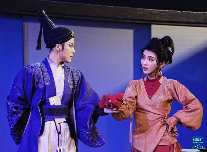越剧演员陈丽君(左)和李云霄演出新编越剧《新龙门客栈》。图源:新华社