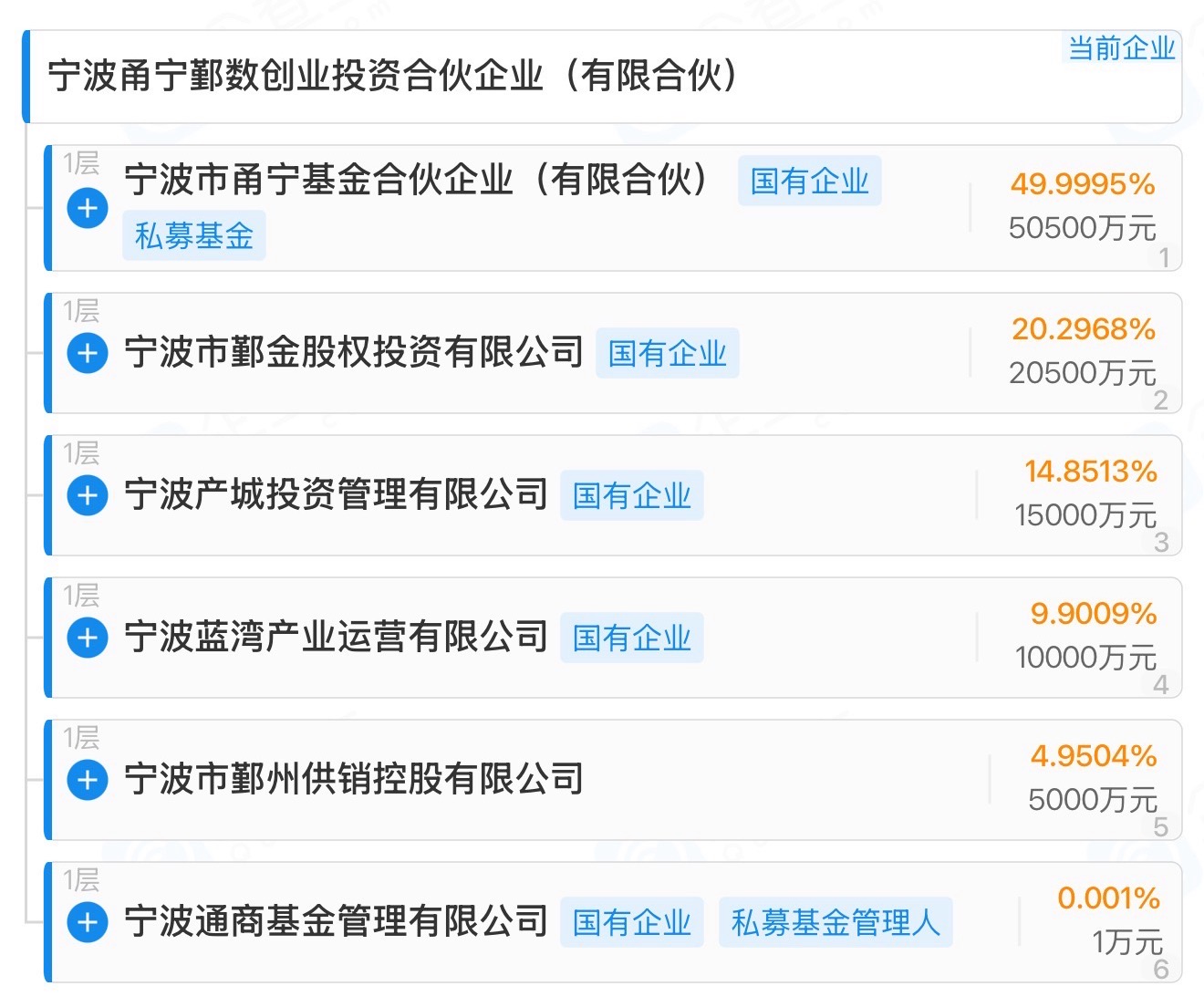 企查查显示,宁波甬宁注册成立于今年11月27日,注册资本10.1亿元人民币。出资方主要为宁波市国资和“通商基金系”,以及鄞州国资等。其中,宁波市甬宁基金合伙企业(有限合伙)出资5.05亿元,鄞州区合计出资5.05亿元(鄞金控股2.05亿元,鄞工集团1.5亿元,湾区集团1亿元,鄞州供销控股有限公司0.5亿元)。