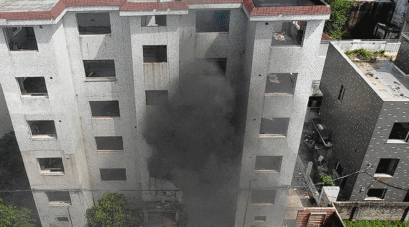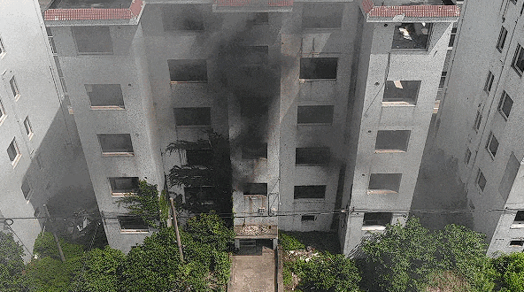 上述实验为达到更好效果,消防员选择废弃居民楼做入户燃烧测试,现实中严禁电动自行车进楼入户!