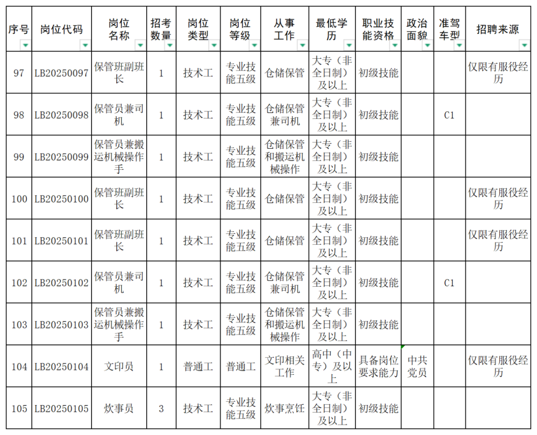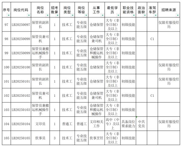 主要有保管员、检修工、司机、卫生员、炊事员、文印员等专业技能三级以下文职人员岗位。