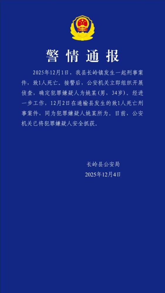2025年12月1日,长岭县长岭镇发生一起刑事案件,致1人死亡。接警后,公安机关立即组织开展侦查,确定犯罪嫌疑人为姚某(男,34岁)。