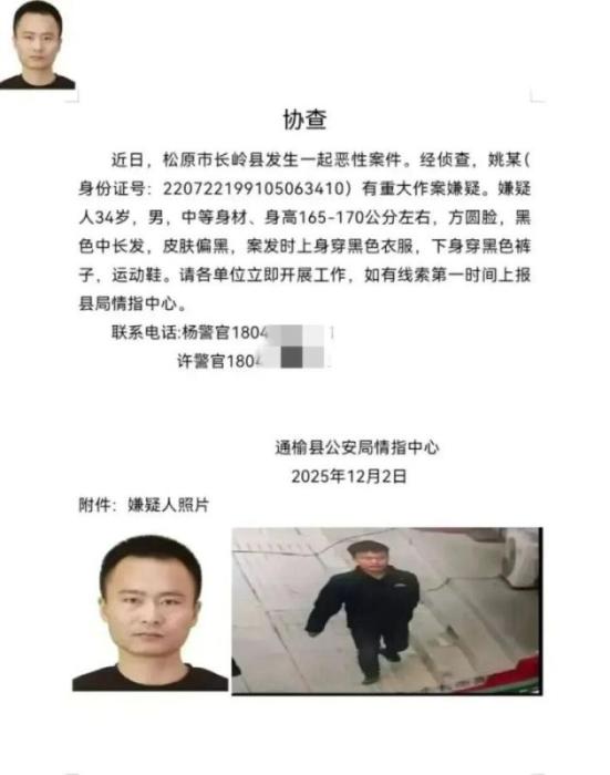 据此前报道,通榆县公安局情指中心12月2日发布的协查文书显示:近日,长岭县发生一起恶性案件,姚某有重大作案嫌疑。