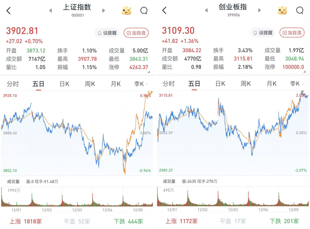 A股三大股指12月5日开盘涨跌互现。早盘两市窄幅震荡,午前出现的拉升演变为午后的支线上涨,在券商股走强带动下,市场呈现普涨态势。
