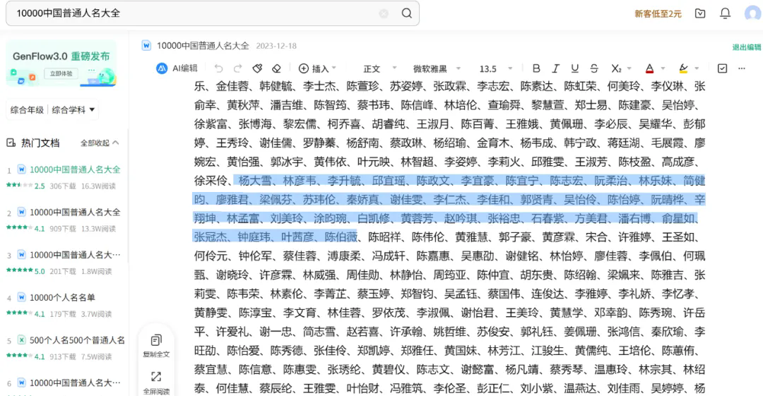 根据网友提供线索,名为“辽宁省科技企业知识转化平台”的网页,2024年9月30日发布的一份《2024年辽宁省非公有制高级职称评审通过人员名单公示》中,公示的58人中有48个名字和百度文库《10000中国普通人名大全》部分名单一致。
