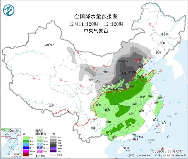 预计11日至13日,四川盆地、江汉、江淮、江南、华南及贵州等地有小到中雨,广西中部、广东北部、湖南南部等地局地有大雨或暴雨;西北、华北、黄淮、东北地区中南部等地有小到中雪或雨夹雪,局地大雪或暴雪。