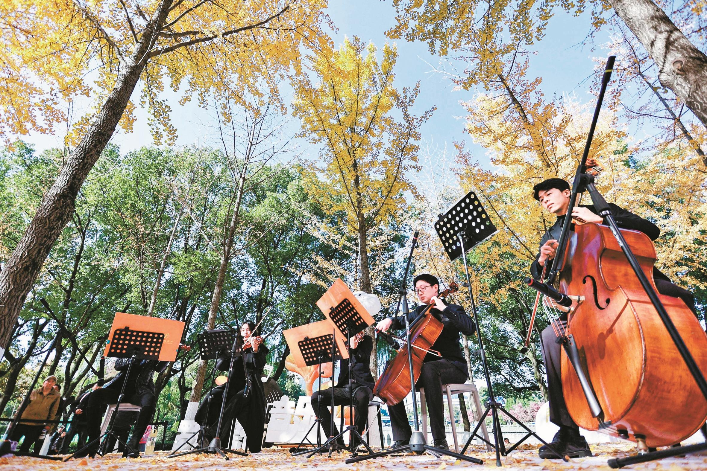 昨前两天,甬城暖阳高照、秋意正浓,正是休闲好时节。天一阁·月湖景区的院士林内,“罗城银杏音乐汇”热闹举行,民谣弹唱、爵士演奏等轮番上演,民族舞、拉丁舞等表演精彩纷呈,为市民游客呈现了一场融合自然风景与艺术氛围的文旅盛宴。(沈天舟 逯林威摄)