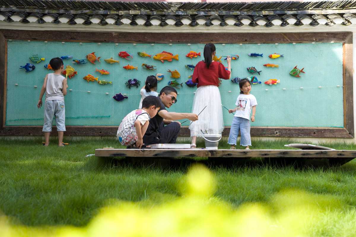 在村干部、党员、村民代表带动下,下渔村边规划、边整治,就地改造提升村庄景观与公共空间,整个村庄发生了翻天覆地的变化。本土乡建艺术家周毅驻村后,深耕村落的历史记忆与渔耕传统:倒塌老屋的残垣断壁,被改造成承载薛氏忠孝家风的“忠孝广场”;闲置多年的老房子,变身“渔文化馆”;废弃的古井,被打造成“饮水思源”景观,映照着村民不忘根本的初心……