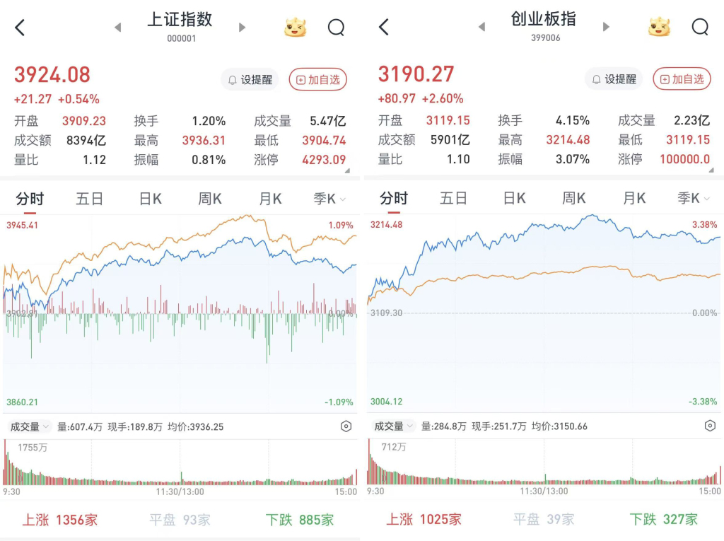 至收盘,上证综指涨0.54%,报3924.08点;科创50指数涨1.86%,报1350.8点;深证成指涨1.39%,报13329.99点;创业板指涨2.6%,报3190.27点。